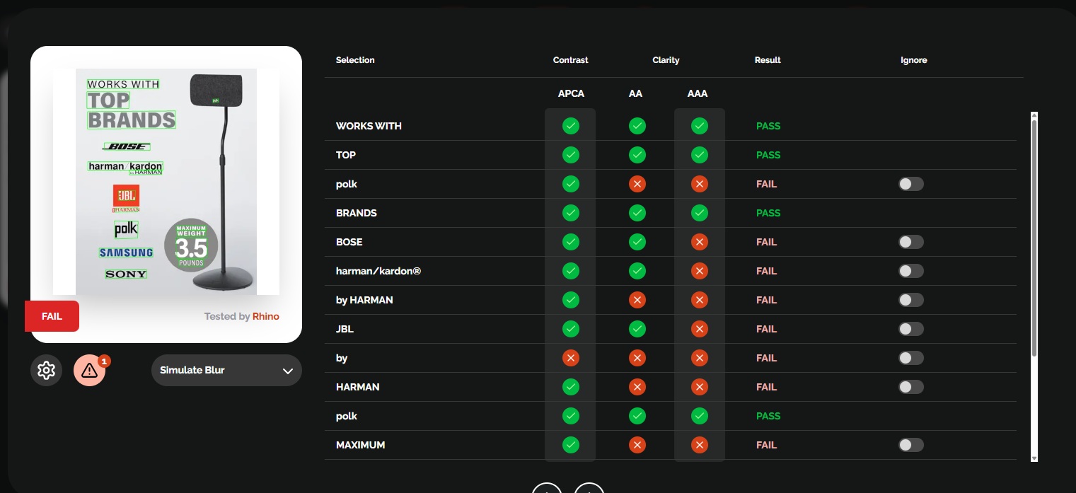 After your images have been analysed, RHINO will show you the comprehensive results of its analysis, as well as a summary Pass or Fail outcome.