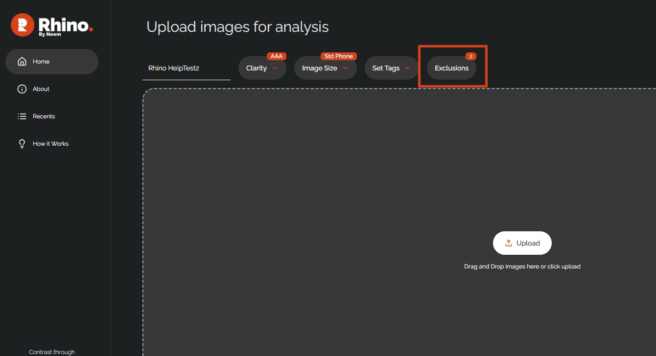 Exclusions allow you to ask RHINO to ignore certain texts that you know will fail but have to be included in the image. This is useful for pack shots that may have text on the fold/be illegible based on size and location, or images that have required text, watermarks or logos that will fail RHINO. Excluded words can only be added before analysis, to exclude words after analysis, check here.