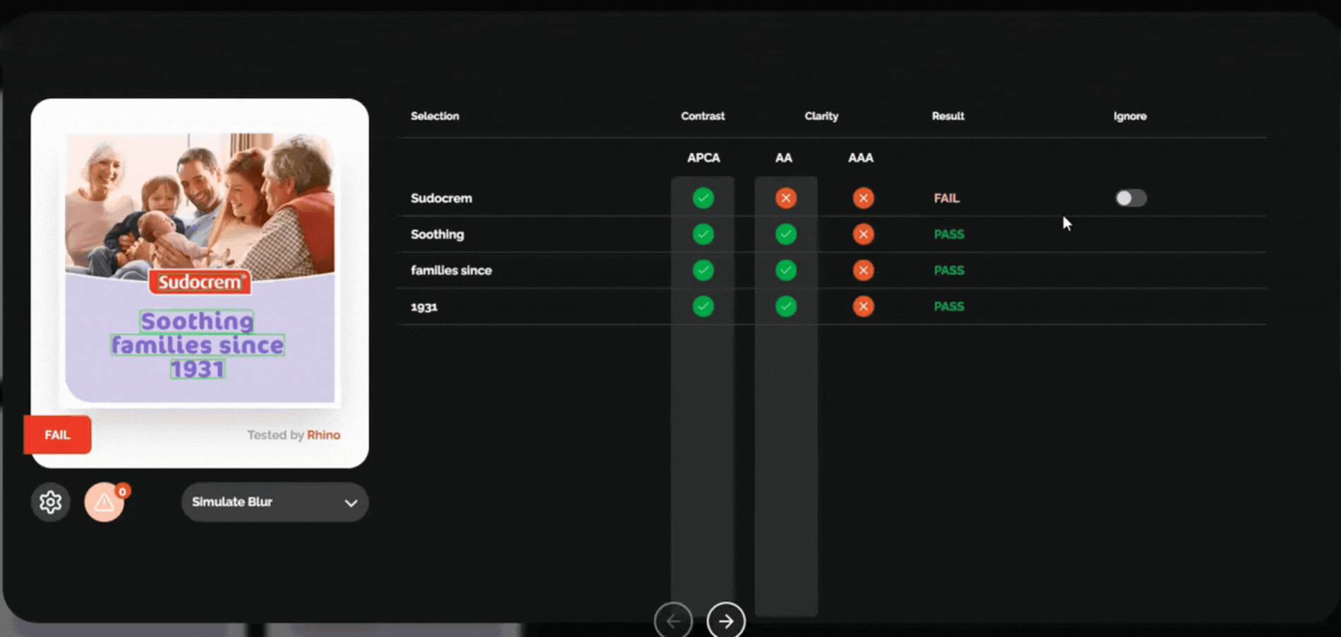 The Ignore Toggle can be found in the detailed results modal. It allows you to tell RHINO to ignore specific words that it has 'read' in the image when calculating the final score. This is useful when you have registered trade marks, bottle designs, false readings and similar.